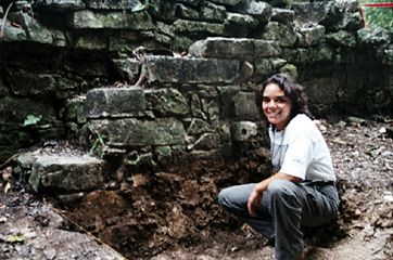 Arq. Patricia Aguirre, pictured next to a small flight of stairs and a cord-tie attachment, is investigating the architecture behind the Temple of the Foliated Cross.