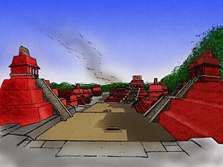 | Reconstructed view looking north from Temple XIX (the site of many of our recent finds). This drawing was used to illustrate a documentary on ABC/Discovery News. The structure straight ahead with the roof comb is the Temple of the Cross. The nearest building on the right is Temple XVIII. The nearest on the left is Temple XX, site of the newly discovered tomb. (Image copyright ABC/Discovery News.) |