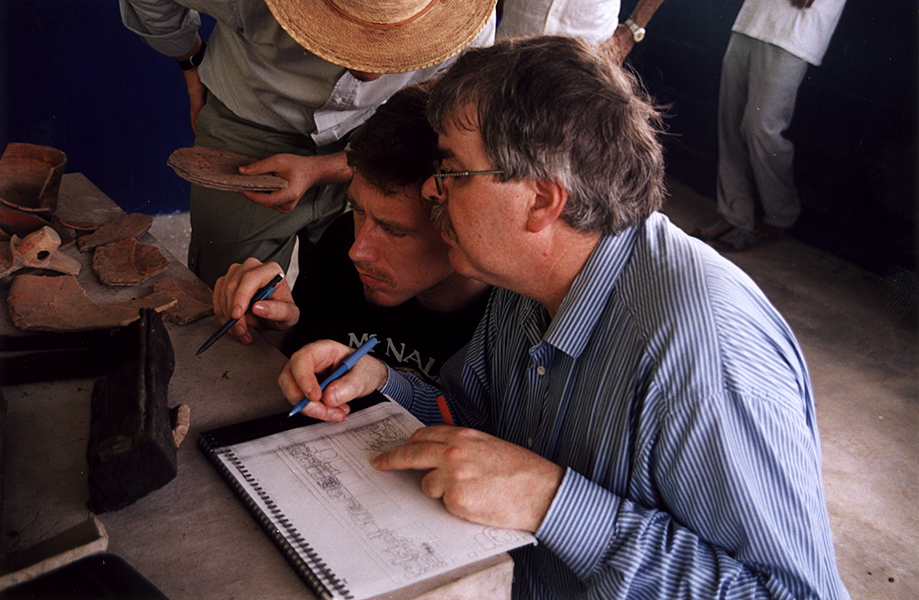 With the help of Stanley Guenter (left), Peter Mathews corrects his preliminary field drawing. (Photo: Joel Skidmore)