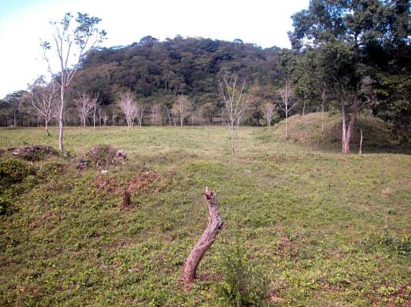 General view of the plaza at Chinikiha, looking north. Numerous buildings are located in the wooded area and to the right of the photograph. Photo: David Stuart.
